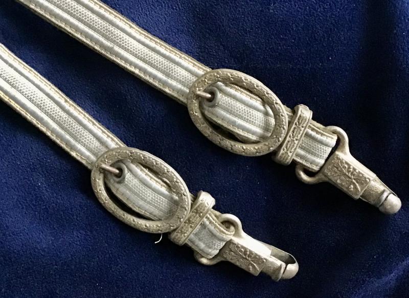 An excellent, extra long set having all deluxe fittings to include oak leaf and acorn decorated lower “push up” spring clips. These clips and the upper box clip are D.R.G.M. marked. Straps have excellent silver tress fronts and velvet green backings. These straps remain stiff when held horizontally.
