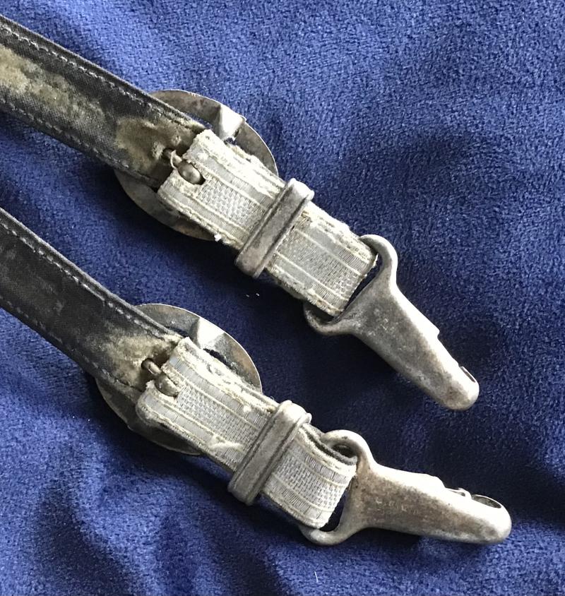 Good de luxe set having the desirable “horseshoe” upper clip with rivets securing the straps. All fittings have oak leaf and acorn embellishments and are DRGM marked. Straps have good tress facings and well worn green velvet backings.