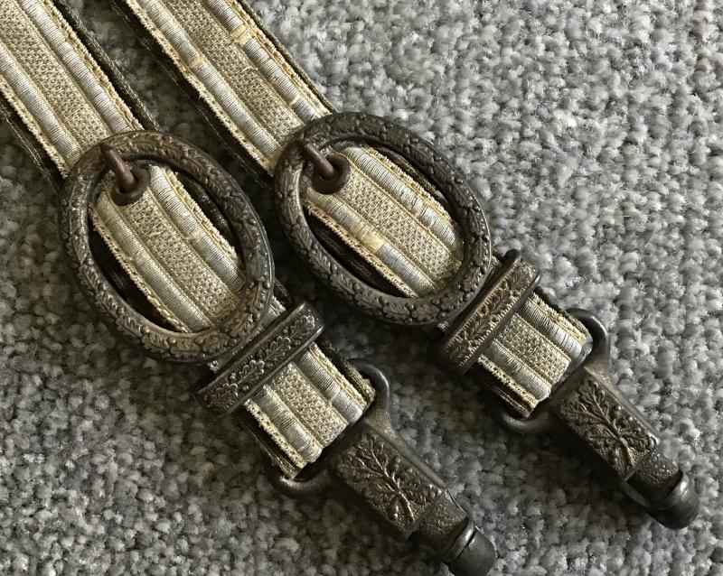 Fine set of the desirable de luxe hangers having the “horseshoe” shaped upper box clip. Lower clips are the push up variety and are D.R.G.M. Marked. All fittings have superb oak leaf and acorn decoration. Straps are in fine condition with no damage or fraying to the tress fronts and only minor wear to the high pile velvet backings.
