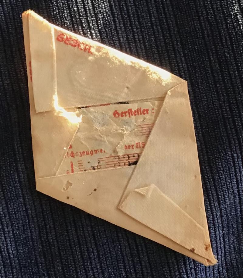 Red white and black Bevo woven insignia for a sports vest or sleeve, folded on the reverse to enclose a paper RZM tag. Marked “Ges Gesch” to the reverse. Unissued, storage wear only