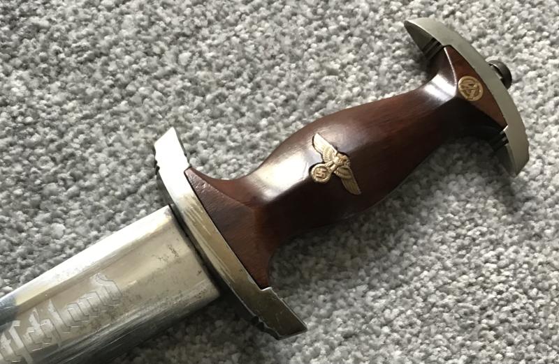 A very rare dagger having still having evidence of gilding on the lower crossguard, a copper grip eagle and rune button. Nickel silver crossguards have no damage, crisp and deep accent grooves and fit the grip perfectly. Scabbard throat still has gilded finish remaining to the upper edge.There is no gau mark on the lower quard. Grip has no damage, dents or pressure marks. Bright blade shows much crossgrain with some minor age staining to the lower reverse. SA motto is deep and crisp with light grey background finish. Reverse upper ricasso area has the “GEBR. GRAFRATH Solingen within a double eclipse logo, and the RZM code “M7/30”