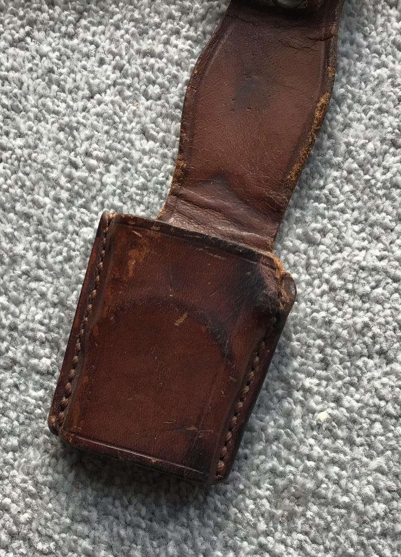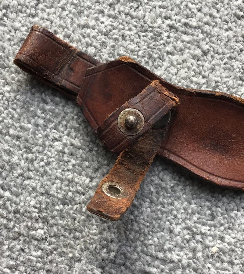 Period vertical hangers are often unique, being constructed by local leather workers to satisfy the needs of keen SA men, and would form a fabulous collection on their own. This example is in brown leather having a grip strap riveted to the “waist” together with a belt loop. One side of the shoe has been left unstitched to facilitate the scabbard ring, in the way of the “Feldherrnhalle” hangers.