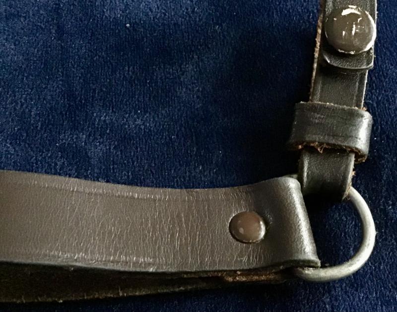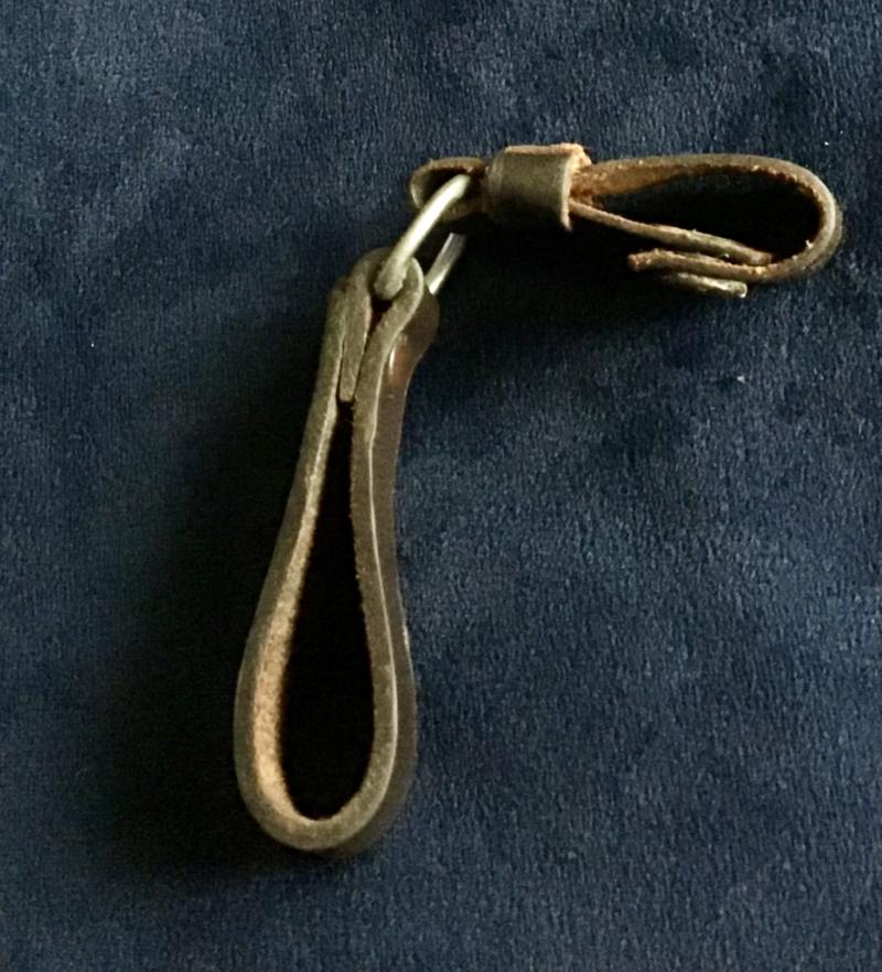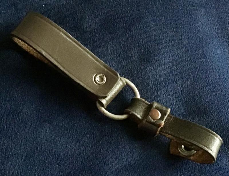 Belt loop is made from quality dark brown leather folded to include a “D” ring riveted in the lower loop. Attached to the loop is matching leather grip strap having a functional snap clip and riveted retaining loop.
