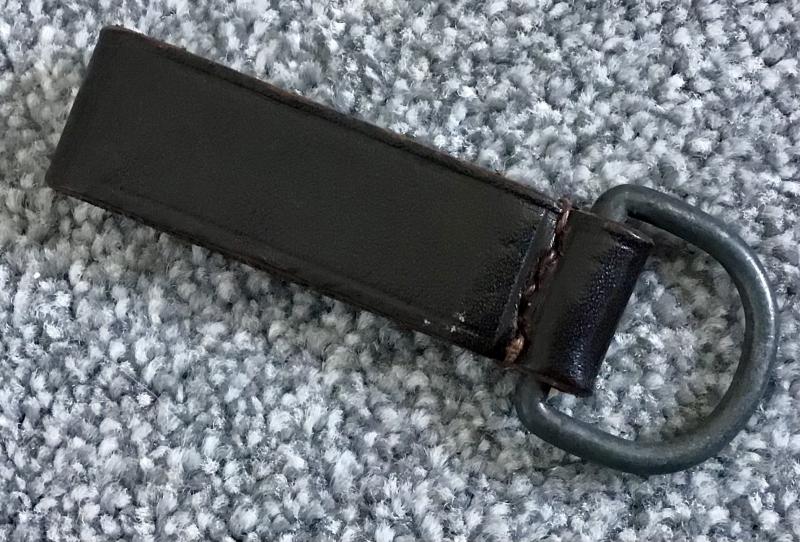 Excellent quality belt loop being a single piece of brown leather folded to enclose a “D” ring sewn in the lower loop. Stamped “RZM L2/5/38 to the reverse.