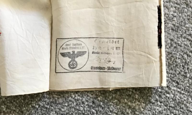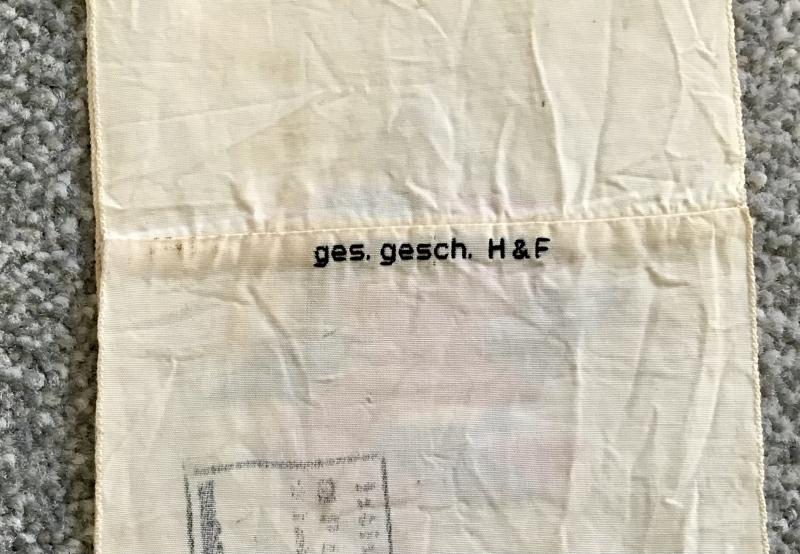 Super, period, tri-coloured example having the TENO emblem machine woven onto cream rayon. Making this piece special is the patent applied mark “Ges.Gesch” and makers mark “H & F” to the rear, and an official ink stamp to the inner surface. Hard to read, but the text appears to mention “Kreis Minden i .W (Minden district in Westphalia and “Landrat” (District Administrative)