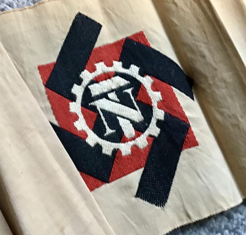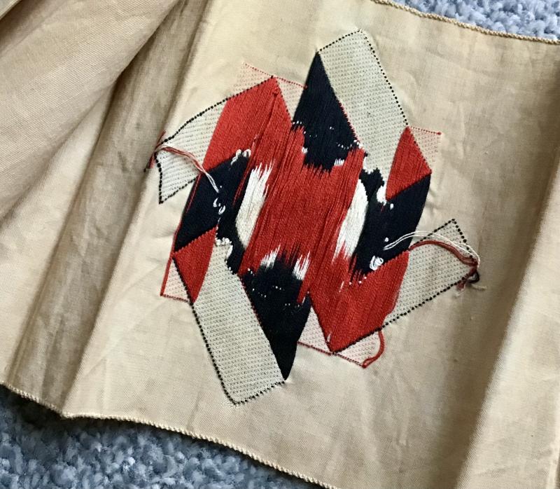 A period original, full length, tri-colour armband having the TENO emblem machine woven to the front face. The German patent mark “Ges.Gesch.”, and the makers initials “H & F” are similarly woven into one short edge. Linen band has some age darkening and creases, however emblem is perfect with no loose threads or tears.