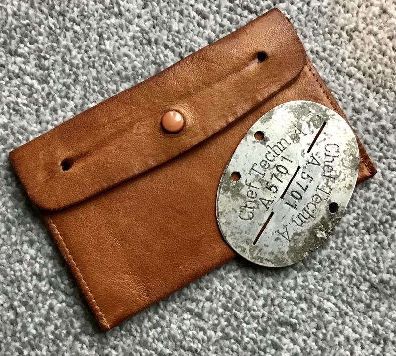 “Erkennungsmarke” for a TENO technician complete with a soft leather carrying pouch. The pouch has an operating snap clip and has holes for a cord or leather strap for suspension round the neck.