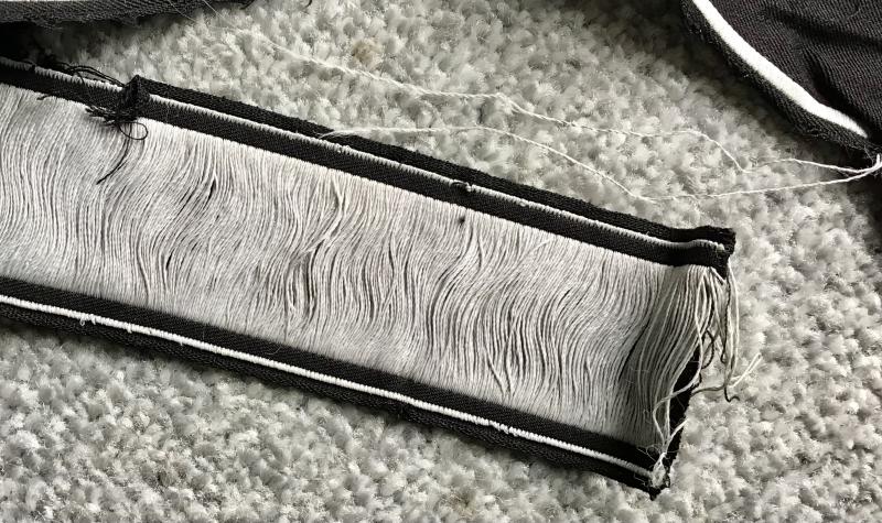 Excellent example of a machine woven cuff band for wear on the fatigue and work tunic. The inscription “Technische Nothilfe” is in silver grey Fraktur script on a black rayon blend background with silver grey piping along the top and bottom. Some minor fraying to the top and bottom edges and to the short ends.
