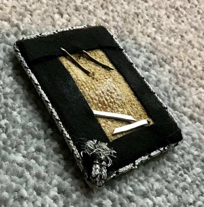 For the ranks of Stabsscharführer to Scharführer, black tab with aluminium/black wire cord piping and an aluminium cog wheel and Laurel sprig.