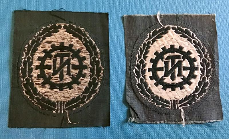 Introduced in 1942, this patch was worn by former TeNo personnel serving with the armed forces. Featuring a silvery grey oak leaf wreath encompassing a central clogged wheel which encircles the overlapping initials “TN”. The patch was abolished in October 1944.