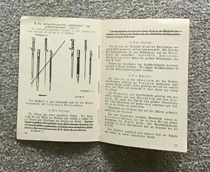 A pamphlet style book originally published in Berlin giving the official requirements for an official Police bayonet, including information regarding the shortening and modifications required for the transformation from Weimar to Third Reich. Great information for the German reader or the google translate app!