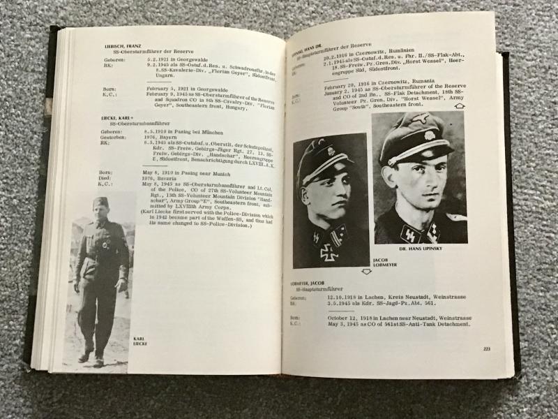In both German and English, this hardback book of some 480 pages by Jost Schneider was published in 1977 and is a documentary history of the Knights Cross Holders of the Waffen SS and Police 1940-1945. Well illustrated and a fascinating read for anyone interested in the personalities of the Reich.