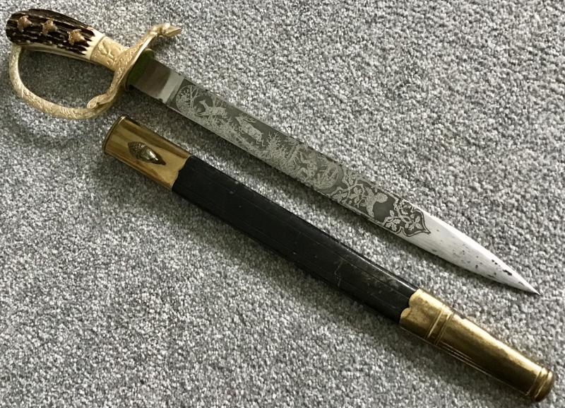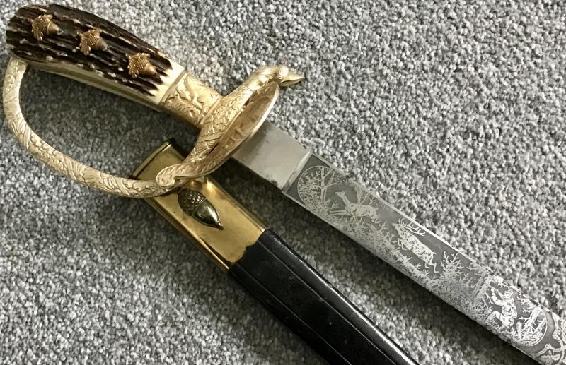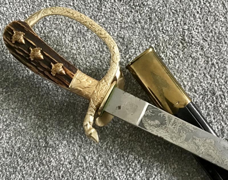 Super piece having the lightweight fittings we like to see on pieces of this era, having the classic Eickhorn squirrel emblem cast into the obverse ferrule area and a chamois cast into the reverse. Highly tactile grip plates are superbly fitted, having detailed acorn emblems. All the gilding remains to the hand enhanced knuckle bow and clamshell which has a stag depiction cast in. Triple etched blade is in excellent condition having very dark background to the hunting scenes on both sides. Minor age staining towards the tip. The ‘35-‘41 Eickhorn trademark is stamped to the reverse ricasso. A green blade washer is in place, beneath which the assembly number “348” is stamped. Leather covered black scabbard has twin line decoration to both obverse and reverse with upper and lower fittings attached by staples.