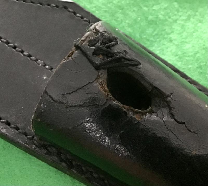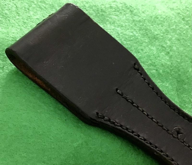 Excellent black leather frog having RZM markings and SS runes in a circle clearly stamped to the reverse. All stitching complete and with a period repair to the scabbard lug hole. Rare item.