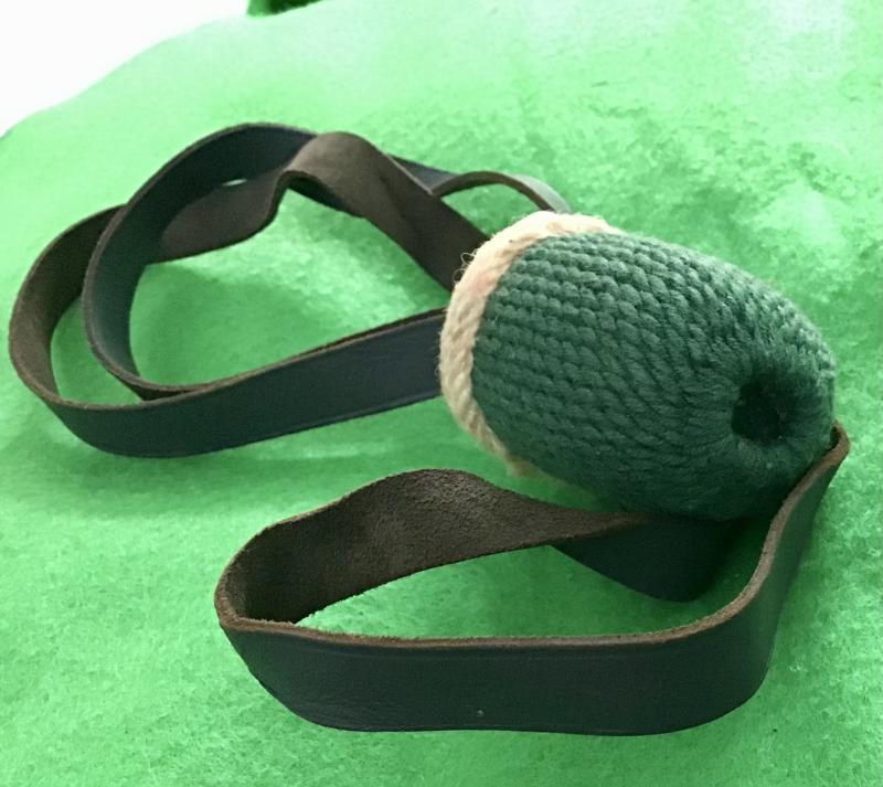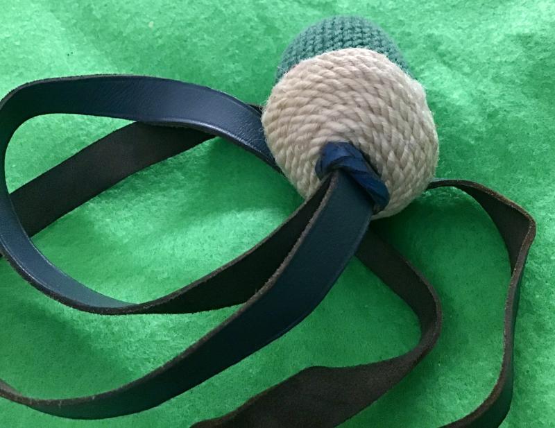 Identified as the correct portepee for a 1st Battalion Staff Member bayonet, it has a grey/blue leather flat strap, blue leather slide, white wooden crown and green oval acorn. Excellent condition.
