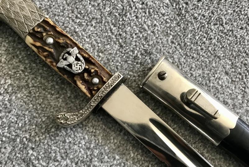 Fine nickel hilt with excellent detail to the feathering at the pommel. There is no rifle slot. The cross guard has the usual raised oak leaves on the obverse and on the reverse, however on the reverse, only the quillion end has the leaves. The center area is stamped with the number "669” which matches that stamped on the reverse of the upper reverse scabbard mount. Interestingly, this number replaces an earlier designation which has been removed with a number of over stamped “X” markings. The grip plates are fine stag with pleasing color browns in the grain. They are retained by aluminum rivets having dressed heads on the obverse. The insignia is the open aluminum type with eagle and swastika over a wreath of oak leaves, showing wear only to the highlights. Bright, heavy plated blade is in excellent condition having a few extremely small areas of rusting to the edges. This blade has been professionally cut down and measures some 13 inches, having a fuller which extends to the tip. The original manufacturers name, “PD Lüneschloss Solingen” is stamped to the reverse ricasso, and a leather washer is in place beneath the crossguard.