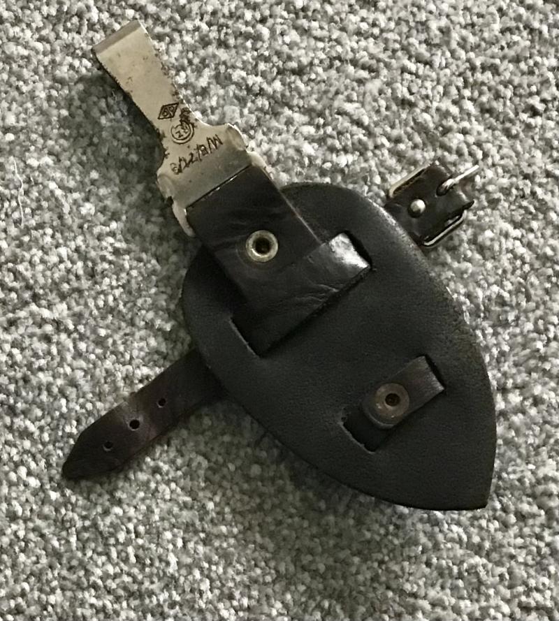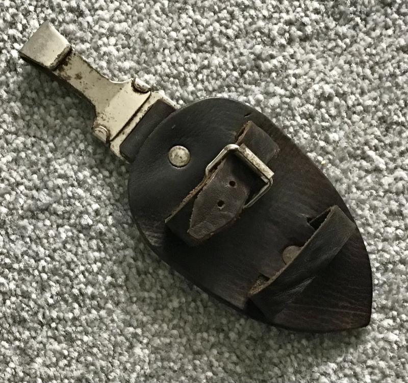 Superb “teardrop” shaped dark brown leather hanger designed to keep the SA dagger in a vertical position when marching or on field exercises. An RZM and OLC marked spring clip is held in a separate strip of leather riveted to the upper section, whilst a leather scabbard support strip is riveted to the lower end. A grip strap with operating buckle is riveted to the centre.