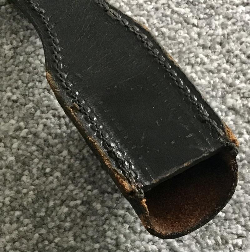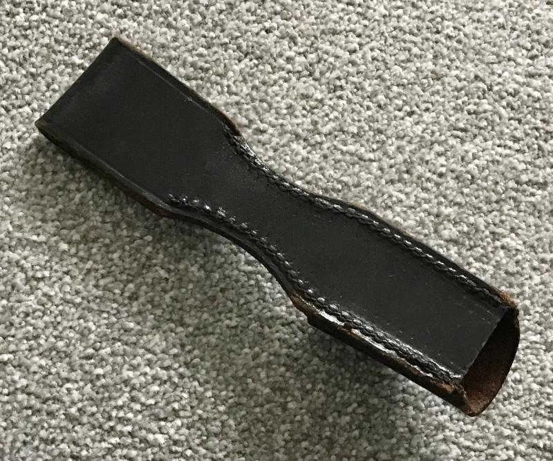 Black leather frog with excellent finish and complete stitching. Lug hole intact with minor split to the upper edge.