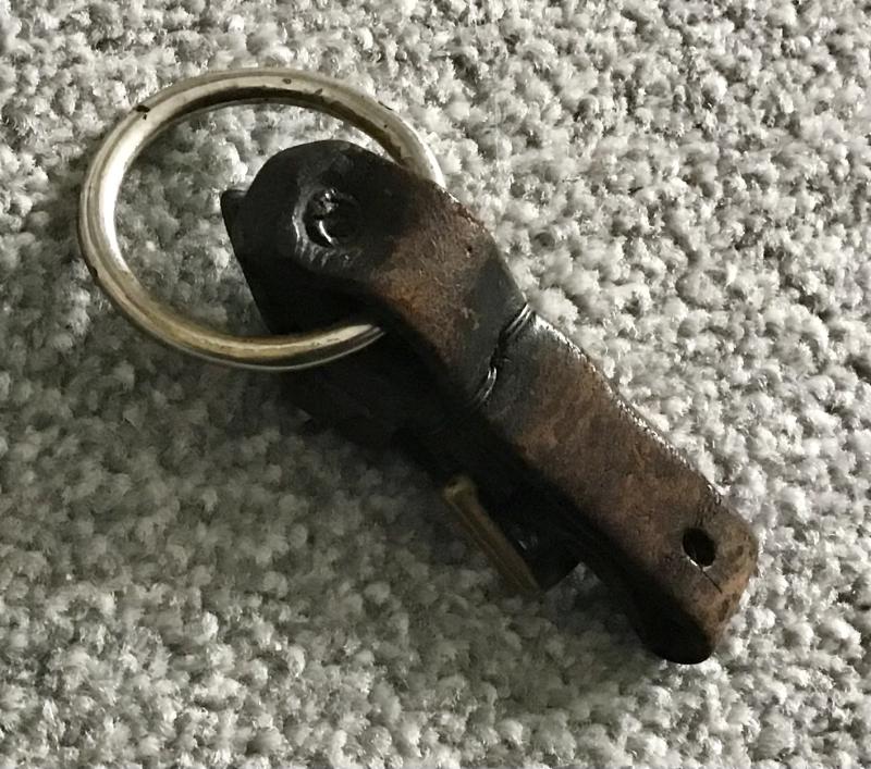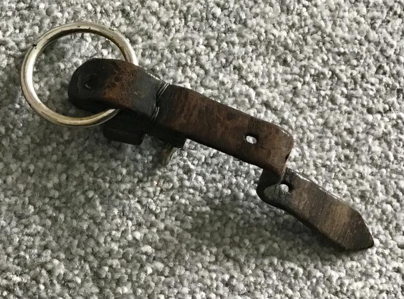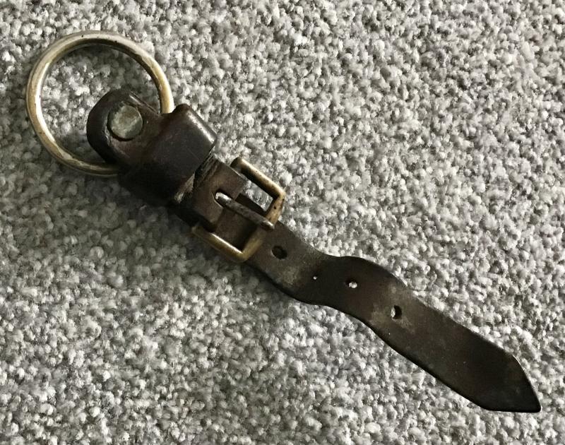 A single piece leather dagger hanger which has been period modified to include a large metal ring where the original spring clip would have been. Held together with rivets and period wire wrap.