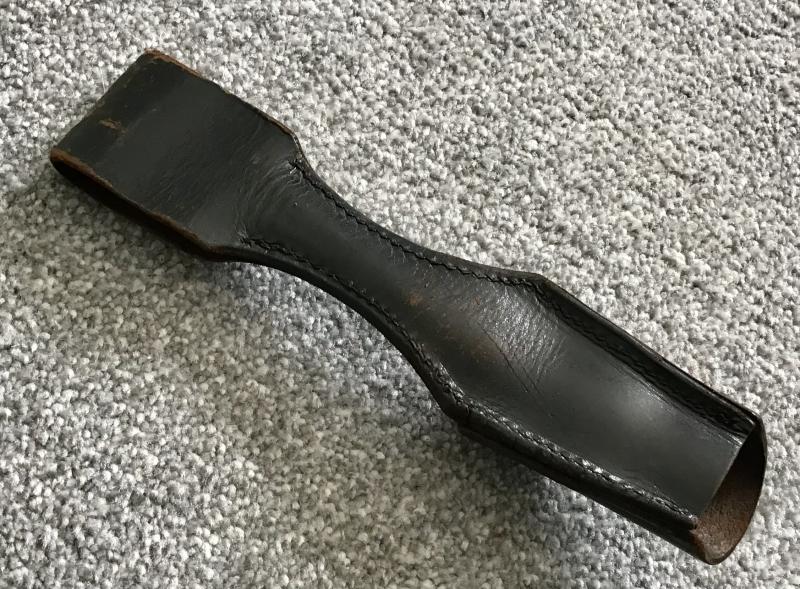 Black leather frog from the dress bayonet. Minor stitching loss to one corner where the shoe meets the backing. No damage to the scabbard lug hole.