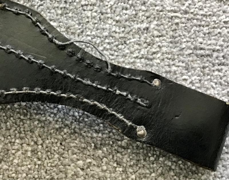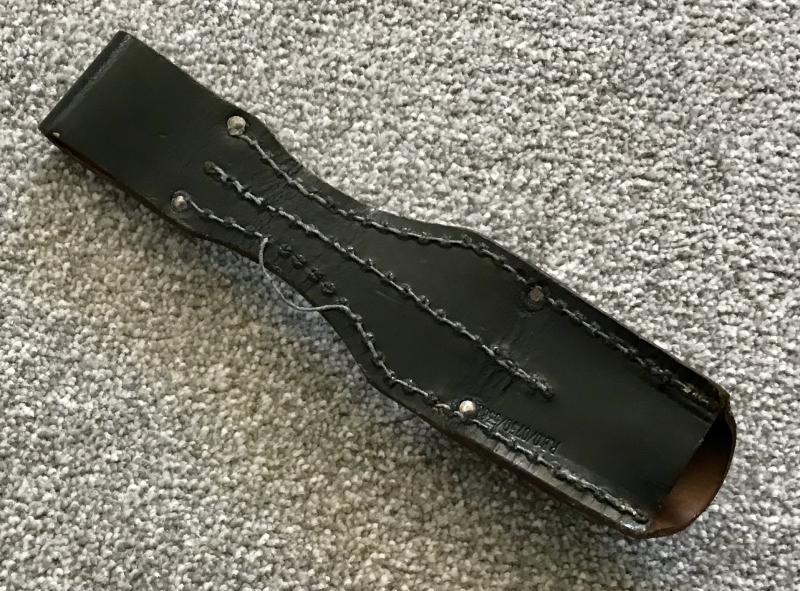 A good black leather frog of four rivet construction having an “RB” number stamped to the reverse. No damage to the scabbard lug hole, some loose stitching.