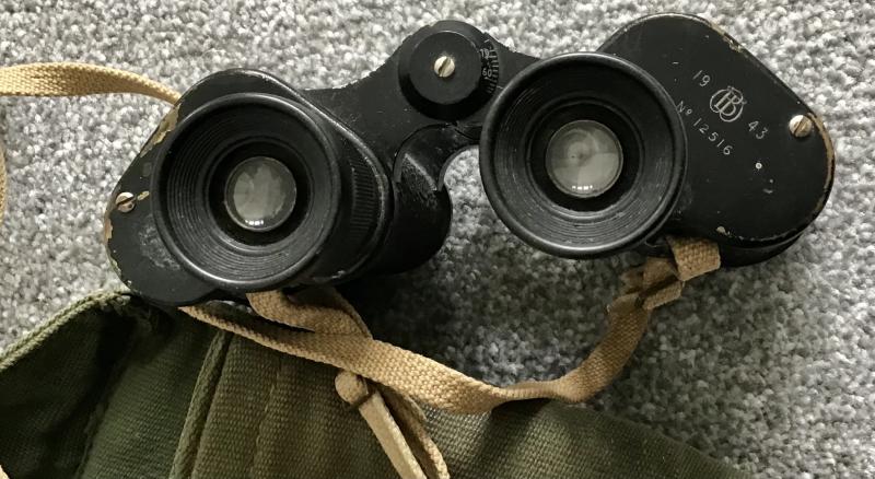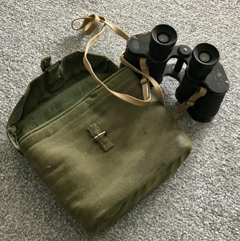Excellent set having clear optics and complete with tropical carrying strap and case. Case is padded and both maker and date marked with MOD “crows foot” marking.