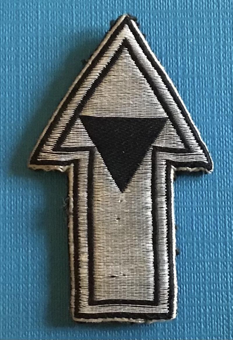 Rectangular black woolen patch having cog wheel and Laurel leaf silver woven insignia. Silver piping to edges.