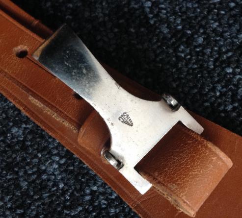 An excellent high quality sword hanger, beautifully made, which is adjustable in length by virtue of a moveable bobbin. Approximately ten inches in length, leather and stitching are in excellent condition, majority of finish remaining to upper box clip and lower Spring clip which runs in the lower loop of the moveable strap. There is no evidence that any felt backing was ever provided for this hanger. An excellent accoutrement of most unusual design which is very difficult to find in this condition.