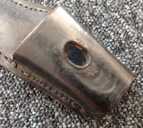 An excellent frog which has become somewhat stiff with age but would no doubt respond to a leather treatment such as Flexolan. Four very small rivets or brads fasten the shoe to the backplate, along with twin lines of stitching which extend as far as the belt loop section. No damage to scabbard lug hole. Minor loss of stitching adjacent to the belt loop on one side. Reverse has a hole at belt loop level presumably to allow period hanging of the bayonet from a nail or similar in barracks.