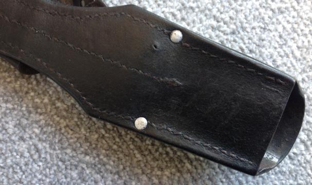 Cavalry version of the black leather K98 frog having a grip retaining strap inserted horizontally to the upper area. Excellent overall condition, of four rivet construction with three perpendicular lines of stitching. No damage to the scabbard lug locating hole.