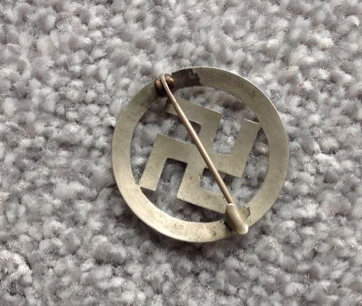 A domed swastica within a circular border some 1.25 inches in diameter. Attachment pin soldered to the rear. Metal still bright to the obverse, somewhat less so to the reverse. Period photographs of BDM girls show similar items in wear.