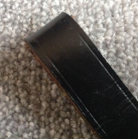 Single piece of quality black leather folded and stitched to include a pebbled "D" ring in the lower loop. Line decoration to the edges of the leather, no loss of finish.