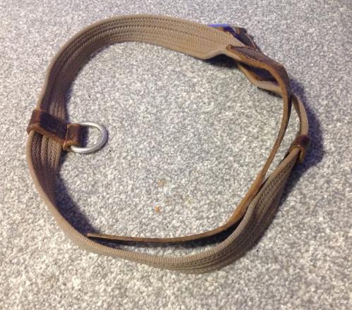Grey belt is in excellent condition, and is complete with leather keeper and equipment hanger. Leather attachments to either end are complete and in good order, having only minor wear to the finish.