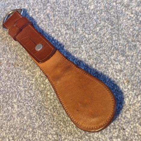 Some ten inches in overal length, this adjustable brown leather hanger has a nickel "D" ring in the upper fold, and a spring clip riveted into the lower teardrop section. All stitching complete and in excellent condition.