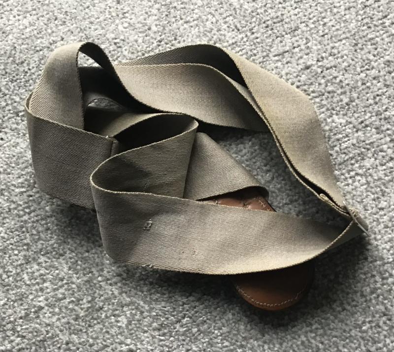 Grey webbing with mild signs of age in places. Black leather teardrop with brown leather backing. Unmarked spring clip stitched to the upper section.