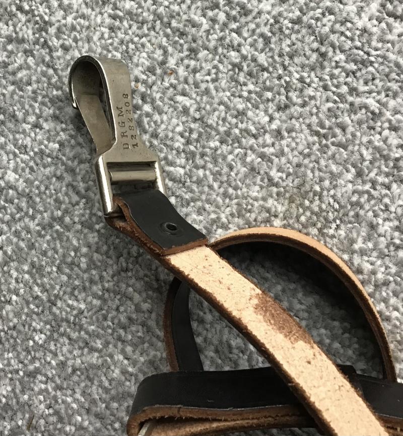 A near mint black leather cross strap having the TENO cogwheel emblem ink stamped to the reverse. Both spring clips and the slide in perfect condition, one clip is marked “D.R.G.M. 1282208”