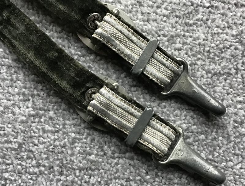 A super set having a plain box clip but Assmann marked oak leaf buckles and slides. Lower clips are the de luxe “push up” variety. Straps are in fine condition having no loss of the tress to the front facings or the green velvet backings.