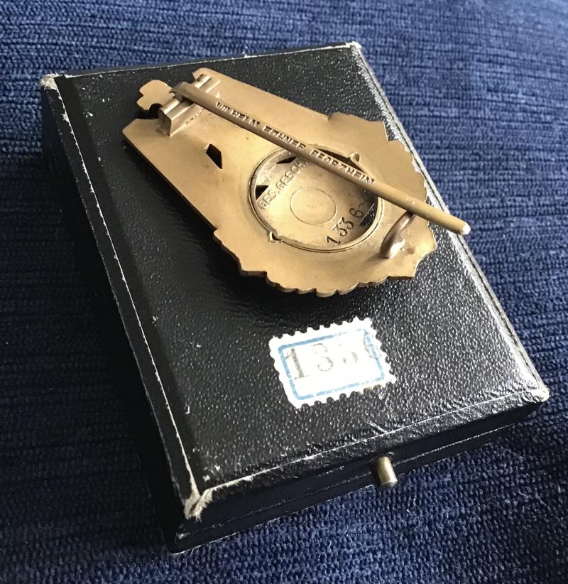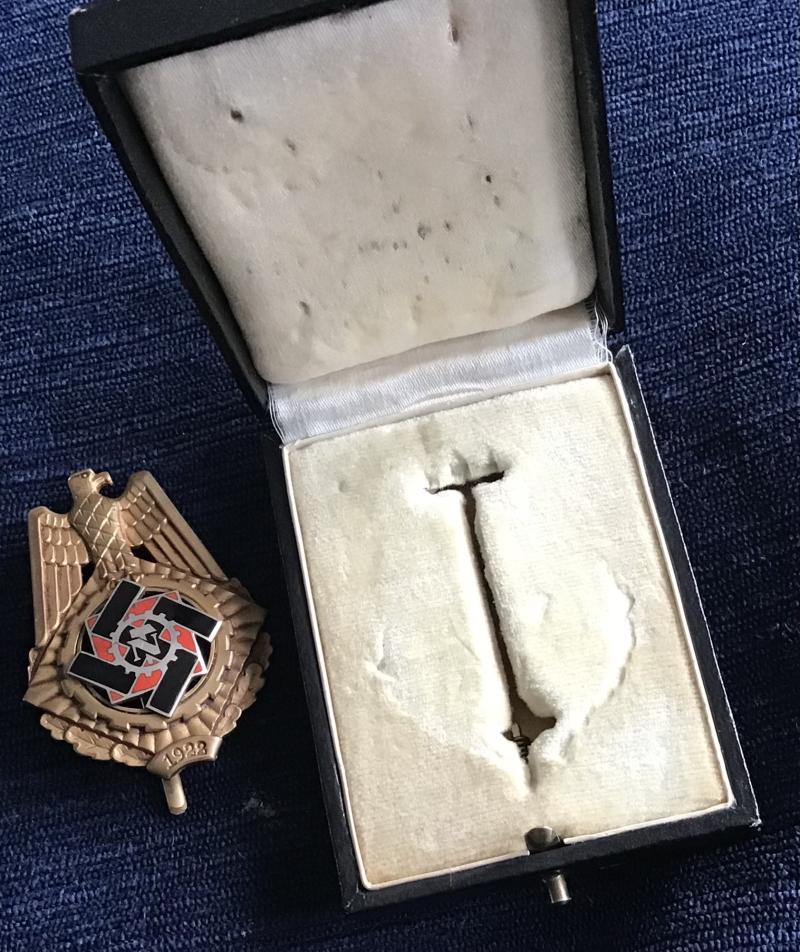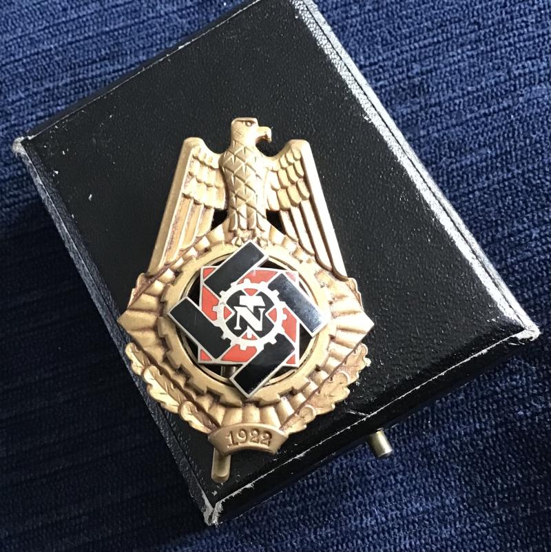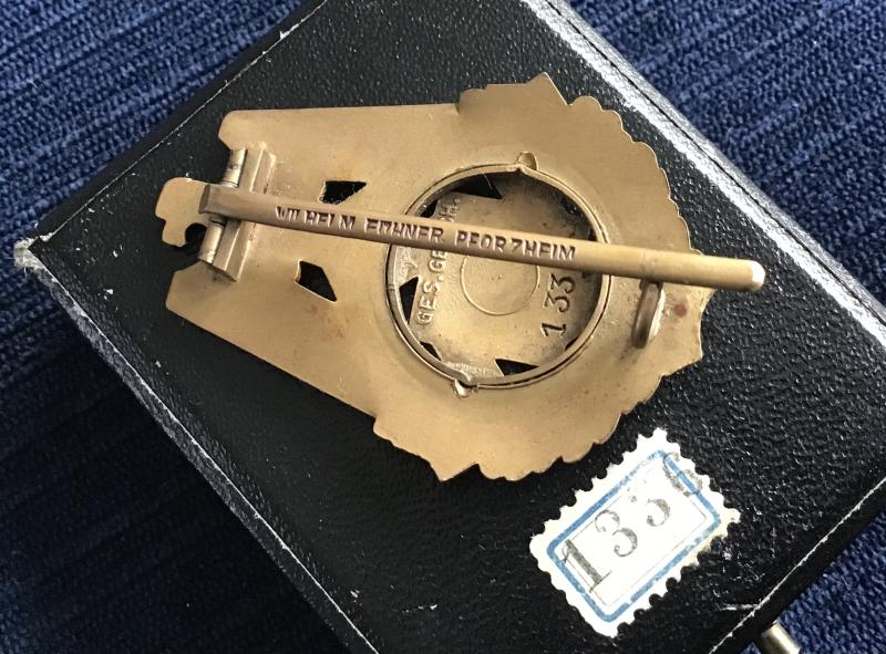 Constructed of gilded tombak with multi-coloured enamels, the obverse consisting of a central enameled Technische Nothilfe (Technical Emergency Corps/TeNO) insignia in the form of a red enameled square overlaid by an enlarged black mobile swastika, in turn inset with a silvered cogwheel surrounding a hammer covered by a letter “N”. These enamelled components sit on top of a cogwheel on top of a diamond-shaped starburst, overlaid at the bottom by a banner bearing a date of “1922” with clusters of oak leaves emanating from each side. The whole is topped by a TeNo-style German national eagle. The reverse has a block hinge and vertical pinback meeting a round wire catch. Reverse is stamped with an issue number of “1336” and “Ges.Gesh. The pin is stamped with the makers name “ WILHELM FÜHNER, PFORZHIEM”, This mint condition badge sits within its original issue case constructed of a light wooden frame with a black faux leather exterior covering , the interior with a white rayon lid liner and intact hinge cover, with a slotted cream velvet medal bed. Box closing with a functional metal spring catch with exterior stud release. A matching issue number of “1336” is visible to the base of the case.