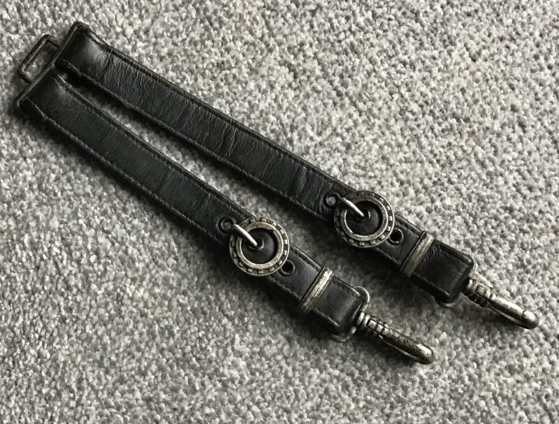 Whilst finding fabric hangers for the TENO Officer is difficult, finding the leather “work” hangers in decent condition is impossible. This set are in remarkable condition having no leather rot or other problems, and still remain stiff when held horizontally. All stitching is intact, and fittings retain most of the factory applied darkening. Lower spring clips are the pebbled variety and are a little stiff, but would free up perfectly with judicious application of a suitable lubricant.