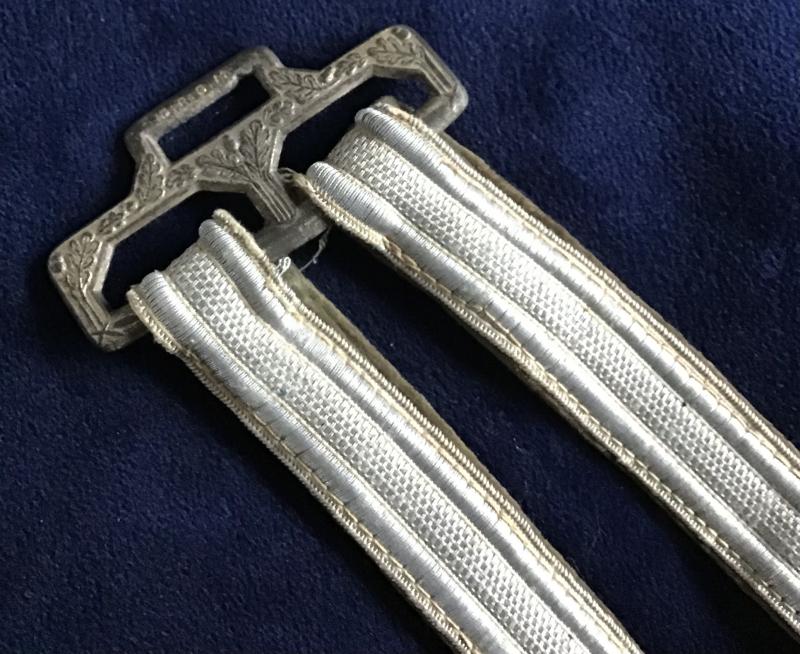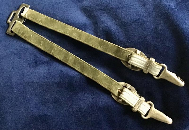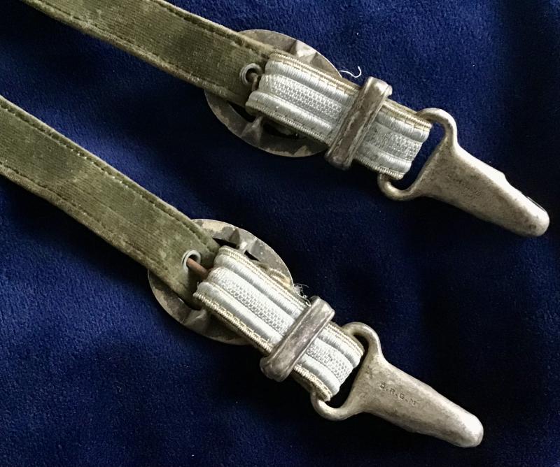 An excellent, extra long set having all deluxe fittings to include oak leaf and acorn decorated lower “push up” spring clips. These clips and the upper box clip are D.R.G.M. marked. Straps have excellent silver tress fronts and velvet green backings. These straps remain stiff when held horizontally.