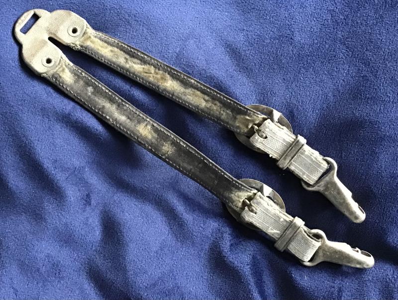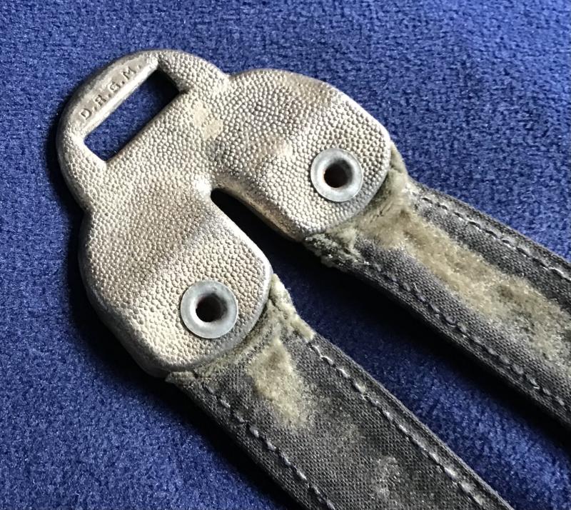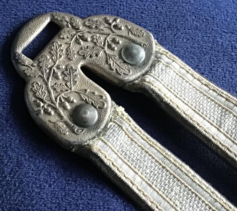 Good de luxe set having the desirable “horseshoe” upper clip with rivets securing the straps. All fittings have oak leaf and acorn embellishments and are DRGM marked. Straps have good tress facings and well worn green velvet backings.