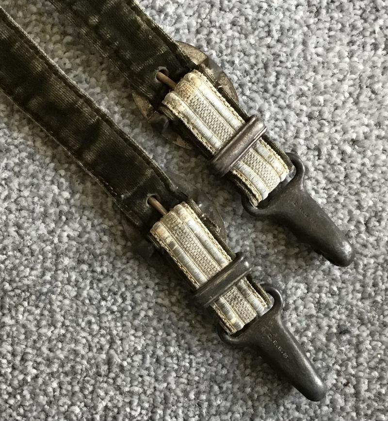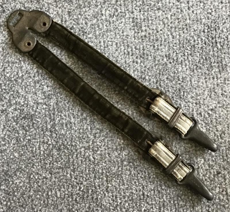 Fine set of the desirable de luxe hangers having the “horseshoe” shaped upper box clip. Lower clips are the push up variety and are D.R.G.M. Marked. All fittings have superb oak leaf and acorn decoration. Straps are in fine condition with no damage or fraying to the tress fronts and only minor wear to the high pile velvet backings.