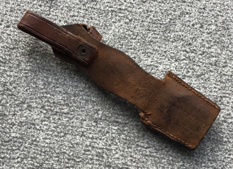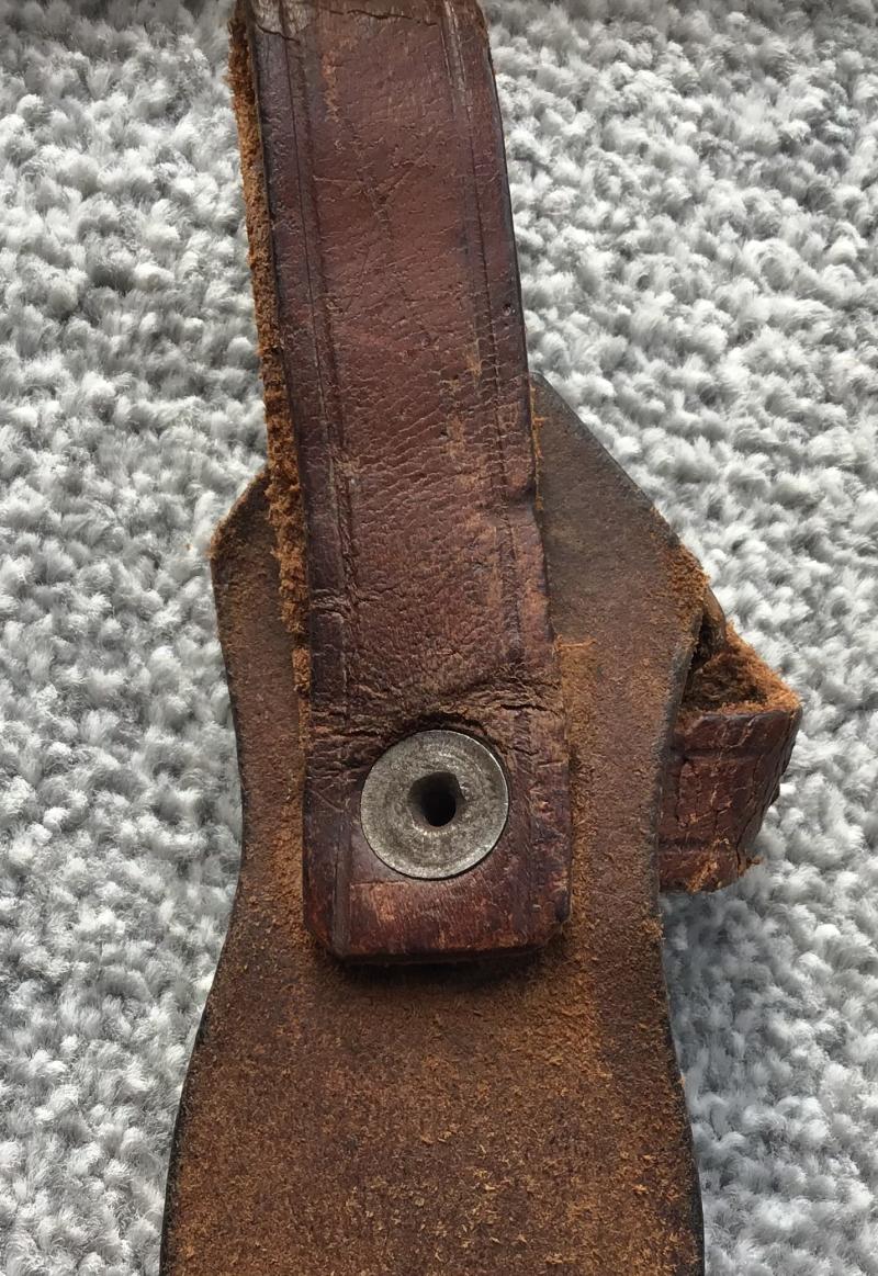 Period vertical hangers are often unique, being constructed by local leather workers to satisfy the needs of keen SA men, and would form a fabulous collection on their own. This example is in brown leather having a grip strap riveted to the “waist” together with a belt loop. One side of the shoe has been left unstitched to facilitate the scabbard ring, in the way of the “Feldherrnhalle” hangers.