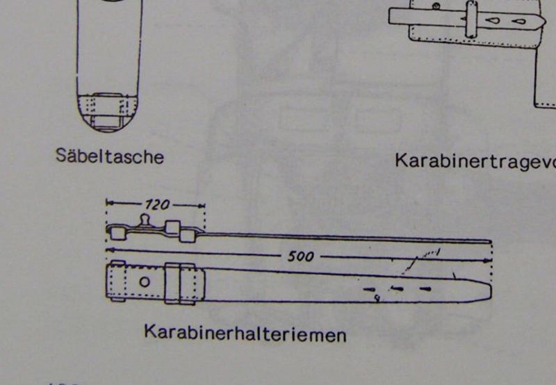 The brown leather attachment (Karabinerhalteriemen) was used for attaching and securing the rifle to the cavalry soldier, and was worn on the back between the bayonet and the breadbag.