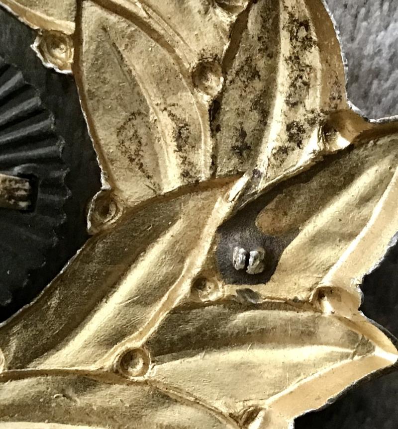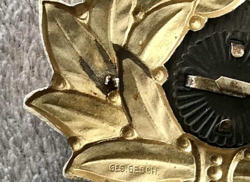 Rear of Laurel leaf wreath is marked “Ges.Gesch and is missing the attachment pins. Cockade has minor wear and both fixing pins.