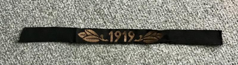 “Traditions TN Jahresärmelband 1919”, as worn by a select number of TENO staffmembers. The cuff-title - depicting interwoven, golden-coloured year-designation: "1919" flanked by two interwoven oak-leaves on a black-coloured background - is beautifully executed in the neat 'BeVo'-weave-pattern ie. 'metallfaden-gewebte Ausführung’. it has two unfinished ends having some minimal fraying and shows some minimal stitching-remains. One of the ends shows an interwoven (but hard to decypher) makers patent-pending-designation (Ges.Gesch). These cuff-titles were intended to signify entry within the 'Technische Nothilfe' and existed for the years 1919 to 1925: they were graded as 'awards' and were only awarded in very limited numbers.