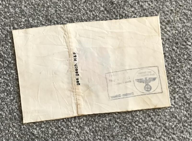 Super, period, tri-coloured example having the TENO emblem machine woven onto cream rayon. Making this piece special is the patent applied mark “Ges.Gesch” and makers mark “H & F” to the rear, and an official ink stamp to the inner surface. Hard to read, but the text appears to mention “Kreis Minden i .W (Minden district in Westphalia and “Landrat” (District Administrative)