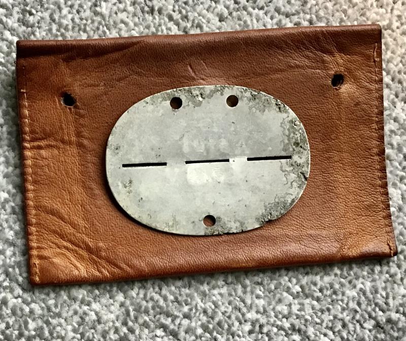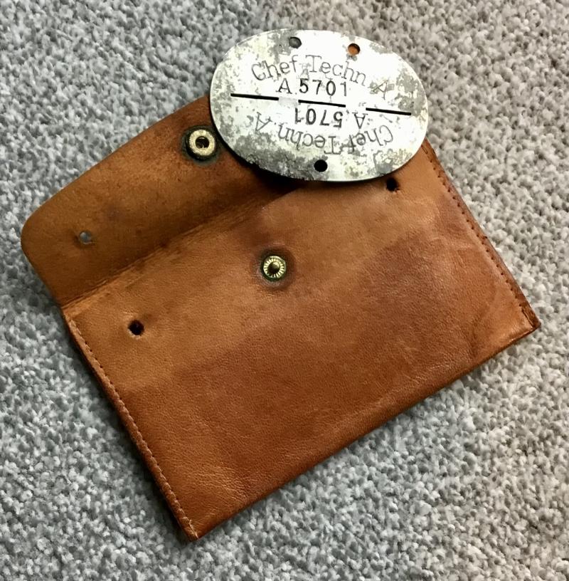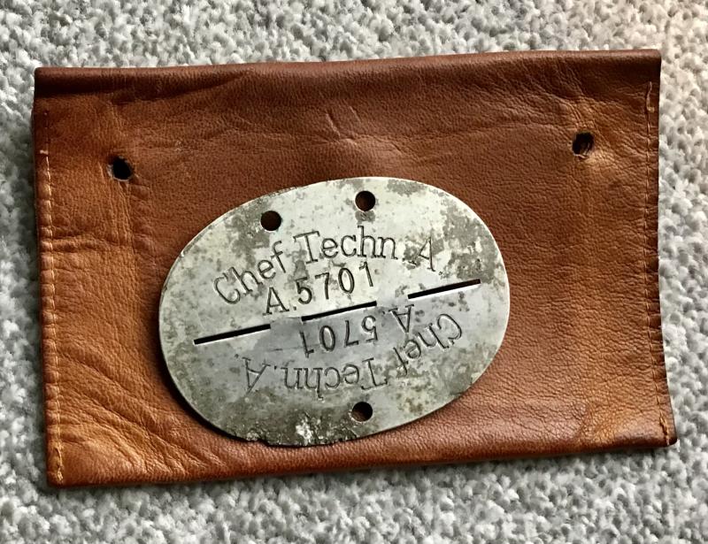“Erkennungsmarke” for a TENO technician complete with a soft leather carrying pouch. The pouch has an operating snap clip and has holes for a cord or leather strap for suspension round the neck.