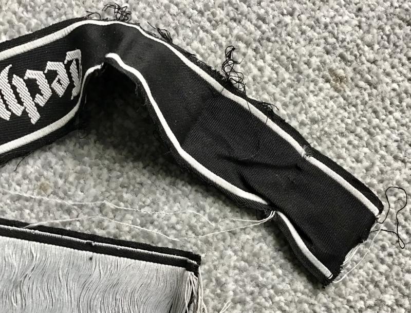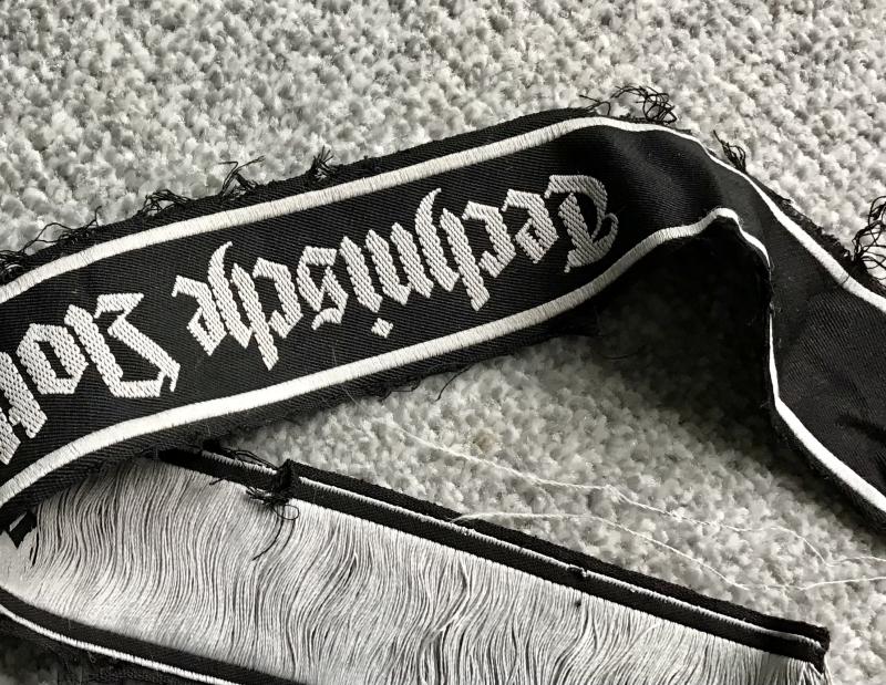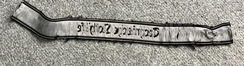 Excellent example of a machine woven cuff band for wear on the fatigue and work tunic. The inscription “Technische Nothilfe” is in silver grey Fraktur script on a black rayon blend background with silver grey piping along the top and bottom. Some minor fraying to the top and bottom edges and to the short ends.