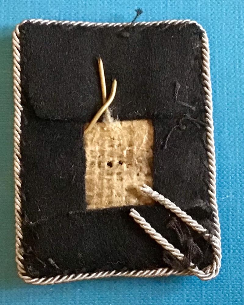 Rectangular black woolen patch having cog wheel and Laurel leaf silver woven insignia. Silver piping to edges. Rare patch